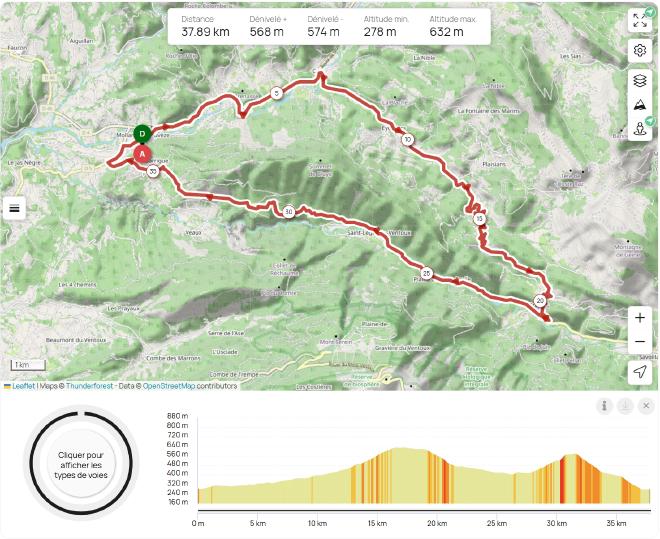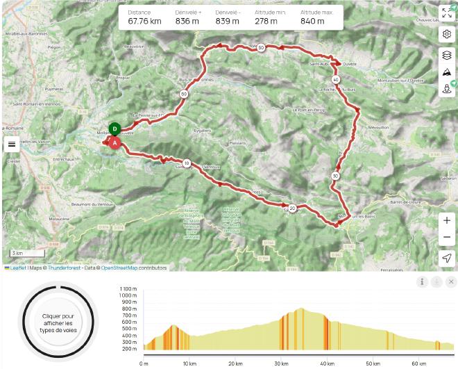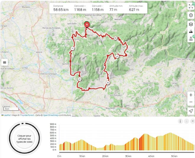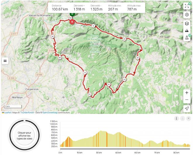 Pour ce Tour du Ventoux , on commencer par remonter le Toulourenc jusqu’à Montbrun, puis direction Sault (nombreux points de ravitaillement). Puis on longe les magnifiques Gorges de la Nesque pour retourner au sud du Ventoux. Le chemin jusqu’à Bédoin offre les vues sur la face sud. On finit par la jolie route du col de la madeleine.