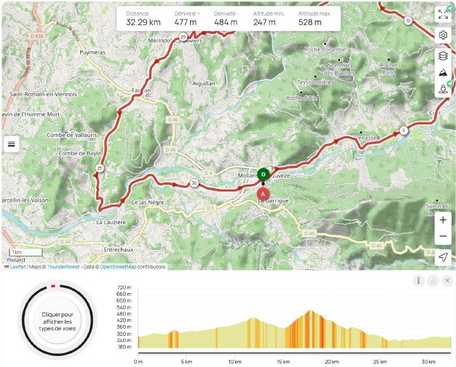Partir vers Buy, tourner juste avant à gauche pour le long faux plat du col de Perponchet. Petite récup en descendant vers Propriac, puis le col de Propriac vous ramène vers Vaison. En option: Retour par Faucon puis en longeant l’Ouvèze, ou directement à la maison