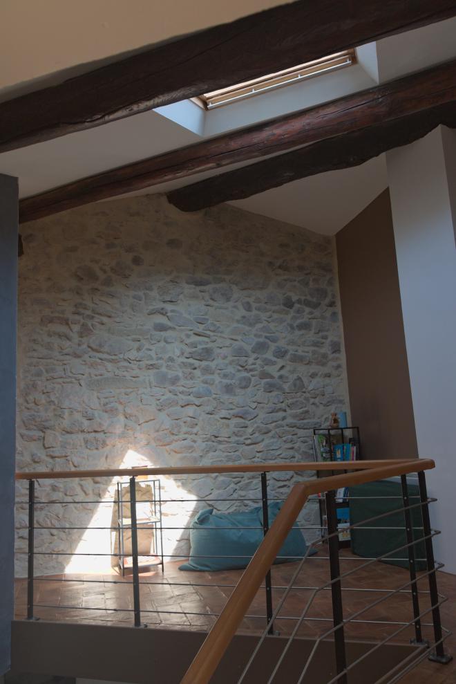 La maison s’articule autour d’un espace central constitué du hall (qui ditribue les chambres rouges et vertes) et la mezzanine au dessus pour accéder à l’étage.