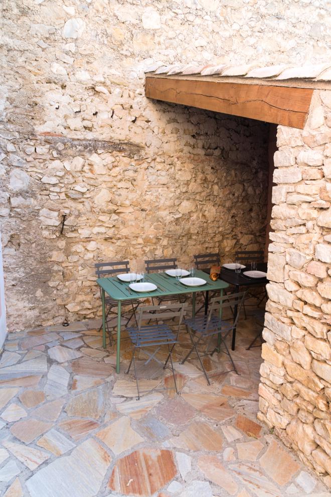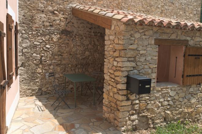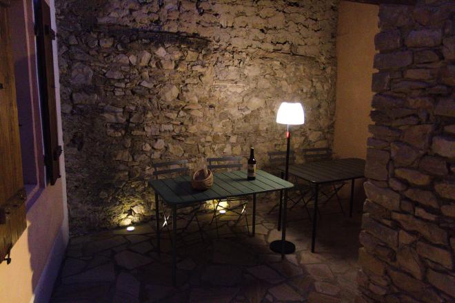 Le patio, devant la maison, idéal au petit déjeuner ou en soirée. La porte de la cuisine permet un accès rapide pour prendre un repas en plein air ou profiter de l’apéritif en soirée grâce à l’éclairage d’ambiance.